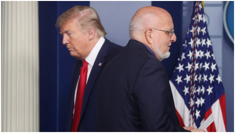 上个月,美国总统特朗普(左)曾和美疾控中心主任雷德菲尔德一同出席新冠疫情简报会。